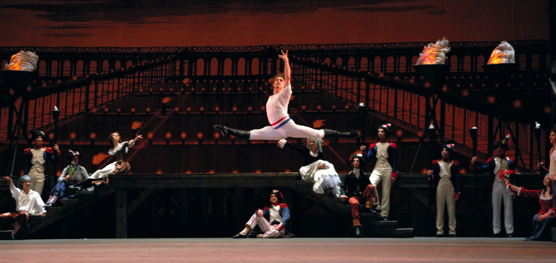 As Philippe and Jeanne, young lovers caught up in the French Revolution, Ivan Vassiliev and Natalia Osipova defy gravity in Alexei Ratmansky's dynamic reconstruction and reimagining of the classic Soviet ballet. Created in 1932 for the 15th anniversary of the October Revolution, Flames of Paris had a libretto adapted from a book by Provençal author Félix Gras and a score by Boris Asafyev based on French popular songs of the revolution. Only 12 minutes of the original choreography by Vasily Vainonen—performed at the Mariinsky Theatre in 1932 and the Bolshoi Theatre in 1933—have been preserved; in effect, Ratmansky fashioned a new ballet while staying true to the era and to Vaionen’s blend of classical and character dancing. The optimistically ideological libretto of the 1930s has also been updated, making it more tragic and humane. The boldly graphic sets and costumes channel French popular prints, and Ratmansky's expressive choreography is executed by Vassiliev and Osipova in a tour-de-force performance.